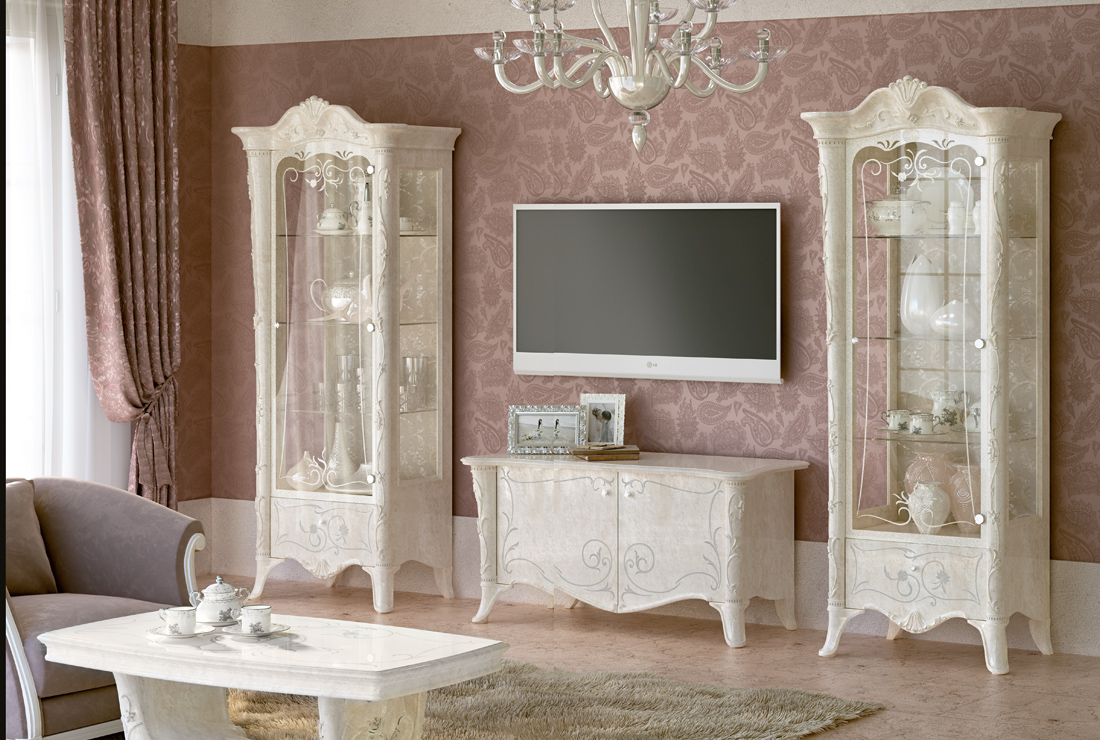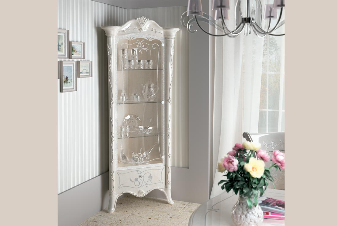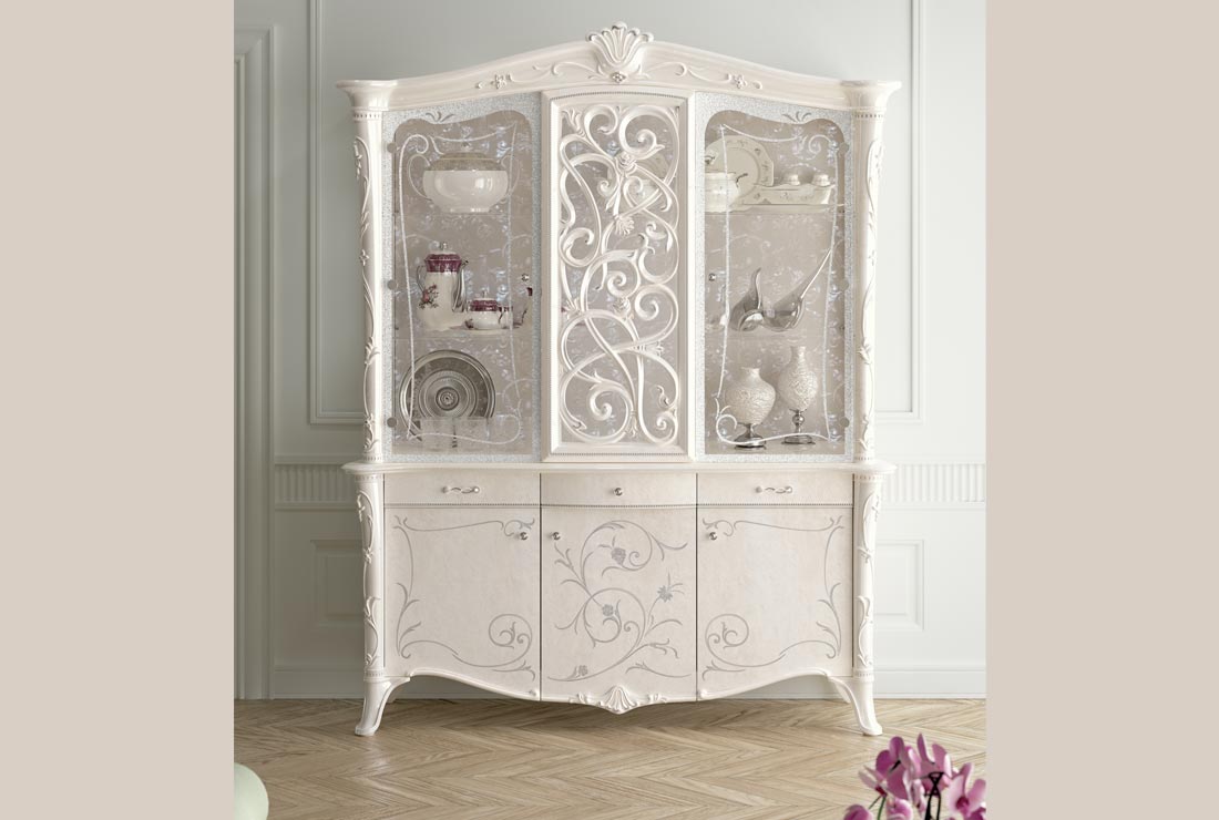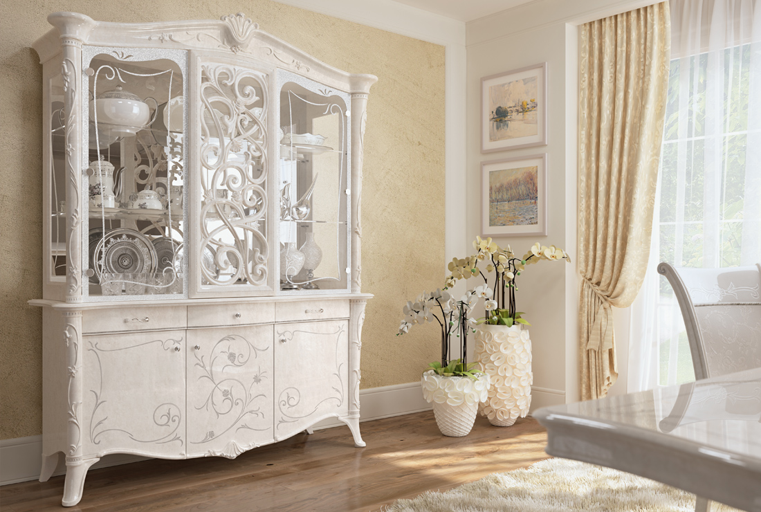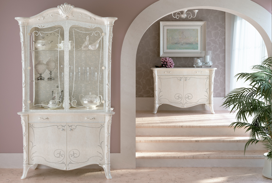 Il tenore generale è uniforme e disteso e privilegia decisamente il chiaro, che sconfina nel bianco. Note di vivacità sono le evoluzioni quasi naturalistiche dei disegni che decorano le ante e gli intagli che arricchiscono l’area centrale della credenza e le basi del tavolo.