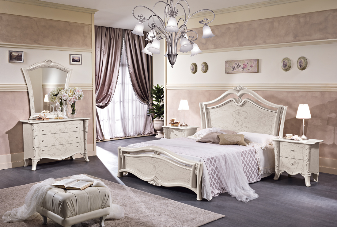 Lo specchio che incorona la cassettiera e la testata del letto che dialoga con la pediera presentano linee che si inarcano verso l’alto, per dare slancio all’arredo. Il colore chiaro, arricchito con le fresche decorazioni disegnate a mano, offre grazia e delicatezza all’insieme.