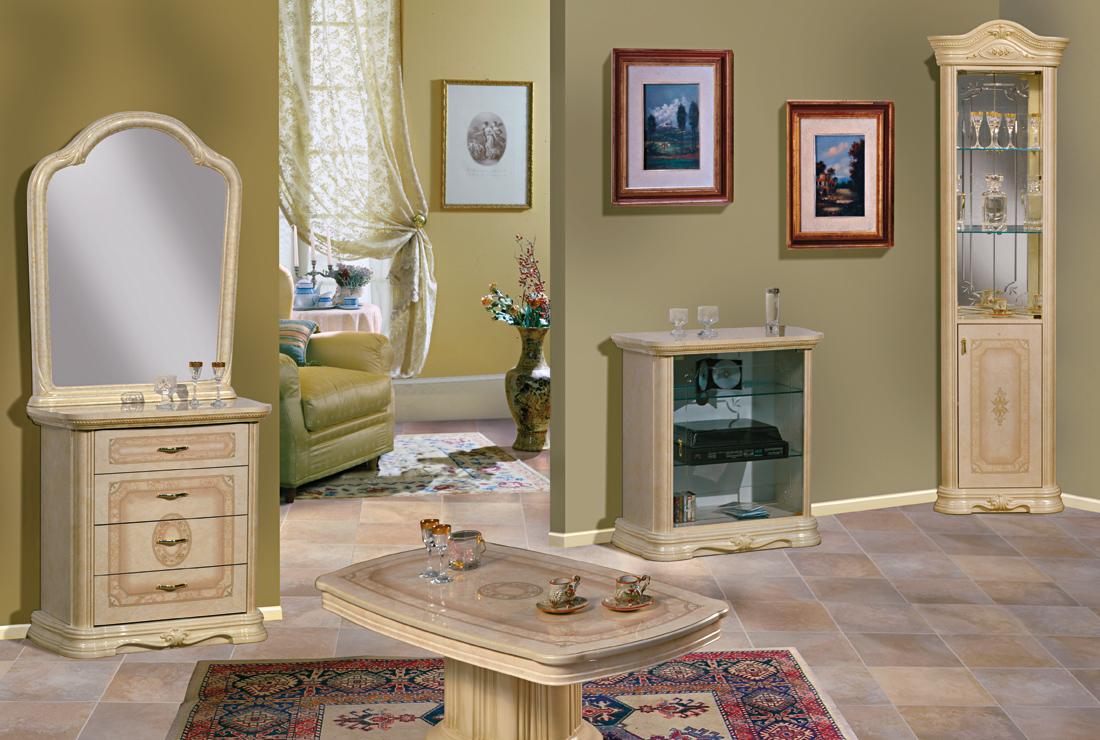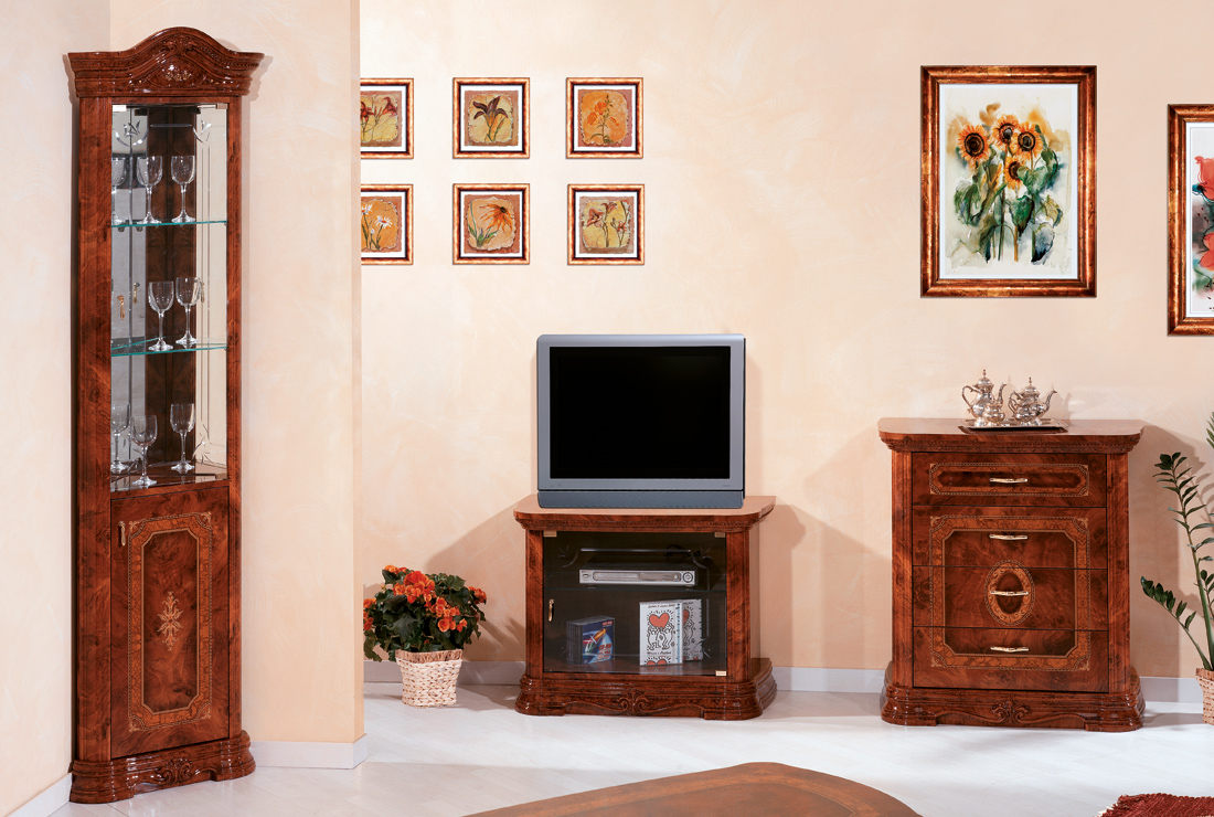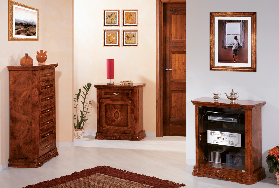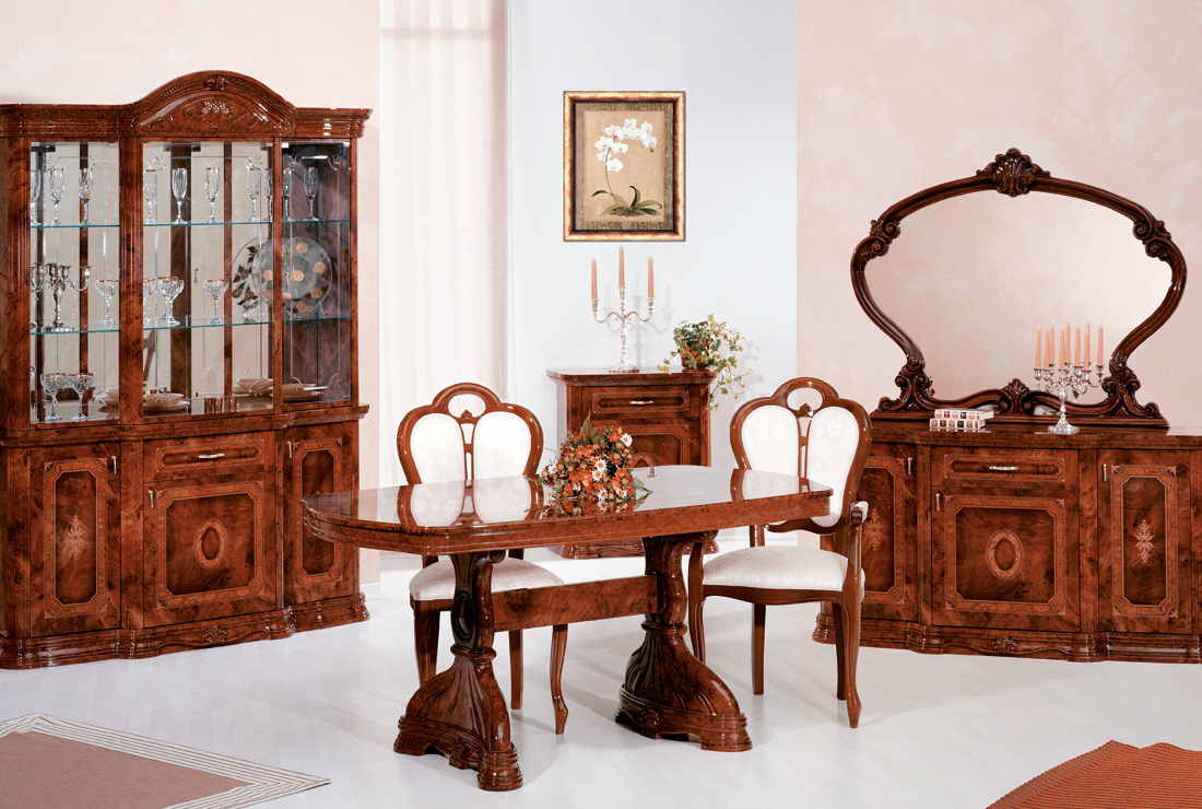 Non c’è risparmio di forme e di fregi, di in questo soggiorno dal sapore orgogliosamente italiano. Ogni elemento, dal tavolo alle poltroncine, alla credenza e al comò, tutto ispira grande fascino, sana ostentazione e genuina tradizione.