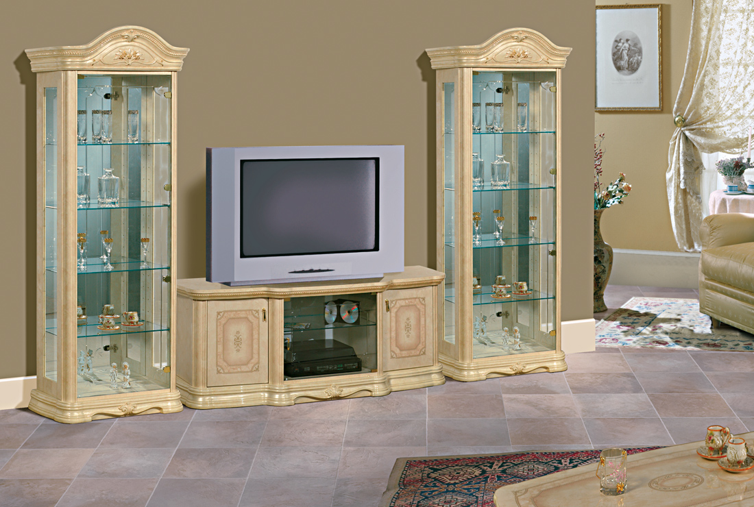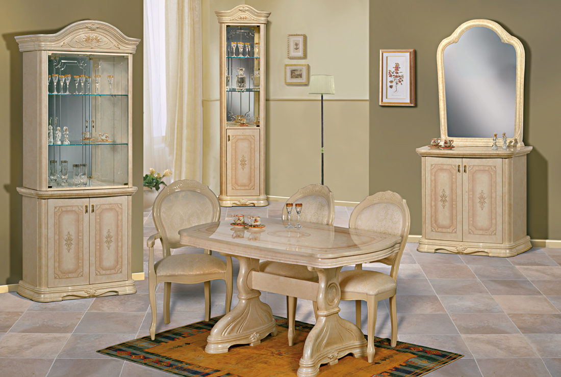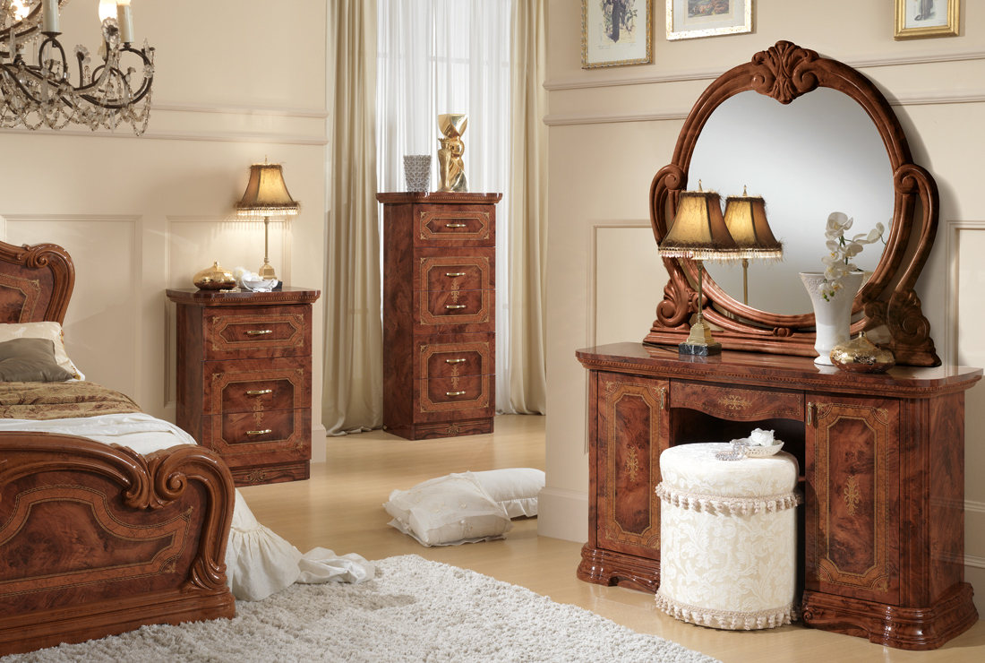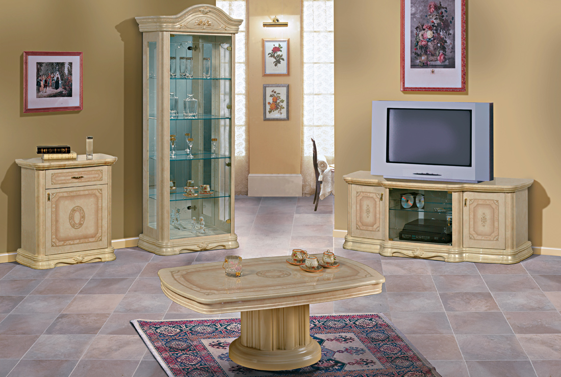 Non c’è risparmio di forme e di fregi, di in questo soggiorno dal sapore orgogliosamente italiano. Ogni elemento, dal tavolo alle poltroncine, alla credenza e al comò, tutto ispira grande fascino, sana ostentazione e genuina tradizione.