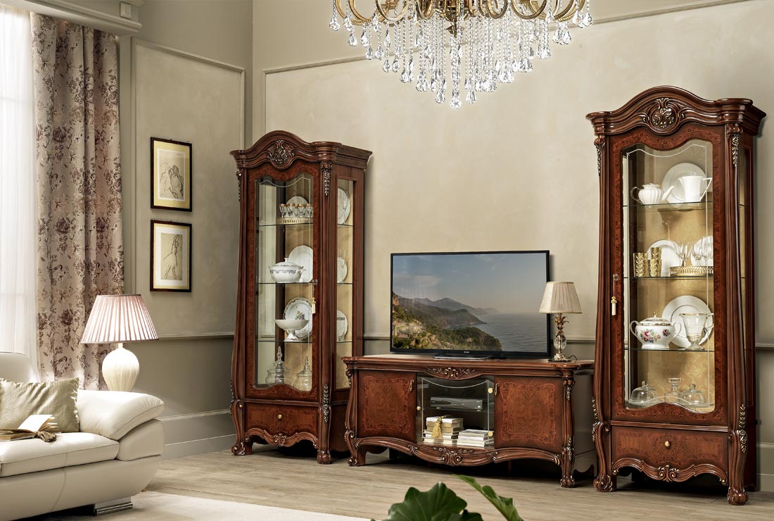Una collezione completa di mobili per la zona pranzo e la zona relax composta da vetrine credenze tavoli e mobili porta tv.