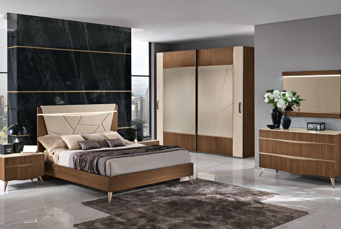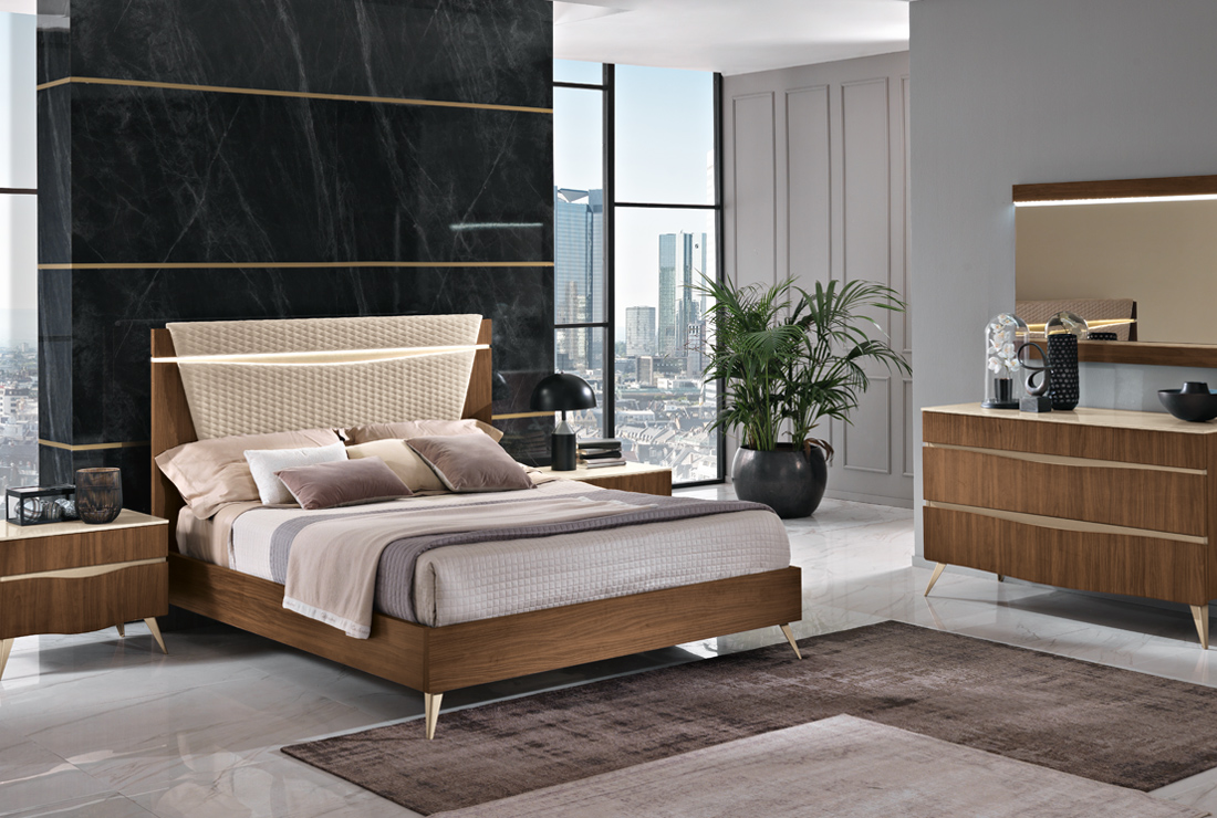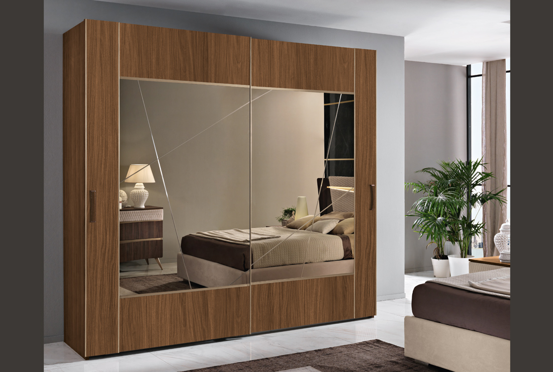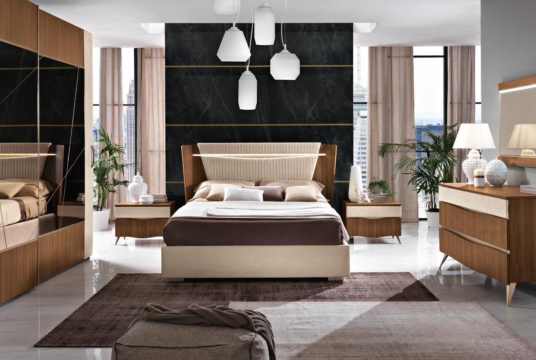 Per il nuovo millennio, ci si è ispirati al design italiano della seconda metà del secolo scorso, che ha riempito di capolavori i musei di tutto il mondo. Il legno è grande protagonista per quanto riguarda la materia. Per il segno, padrona assoluta è la sezionatura irregolare che decora la testa del letto e la grande specchiera dell’armadio.