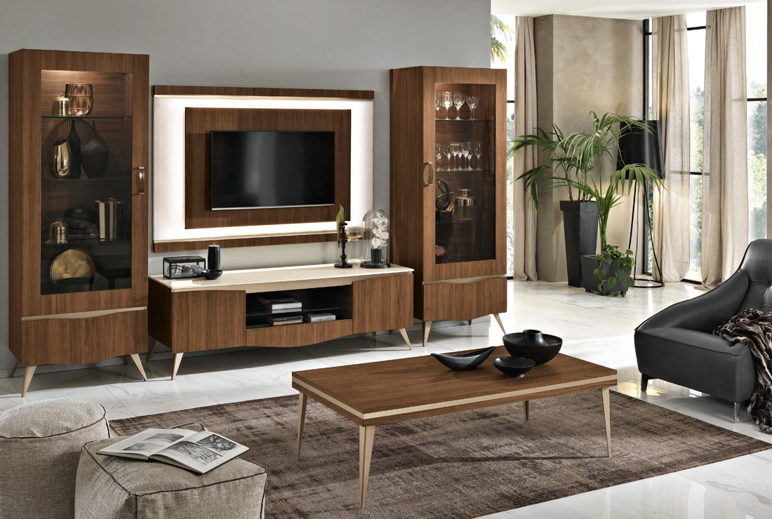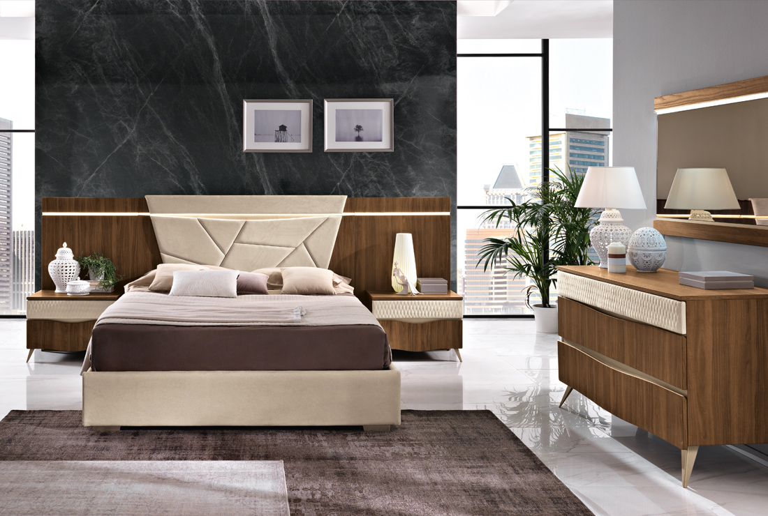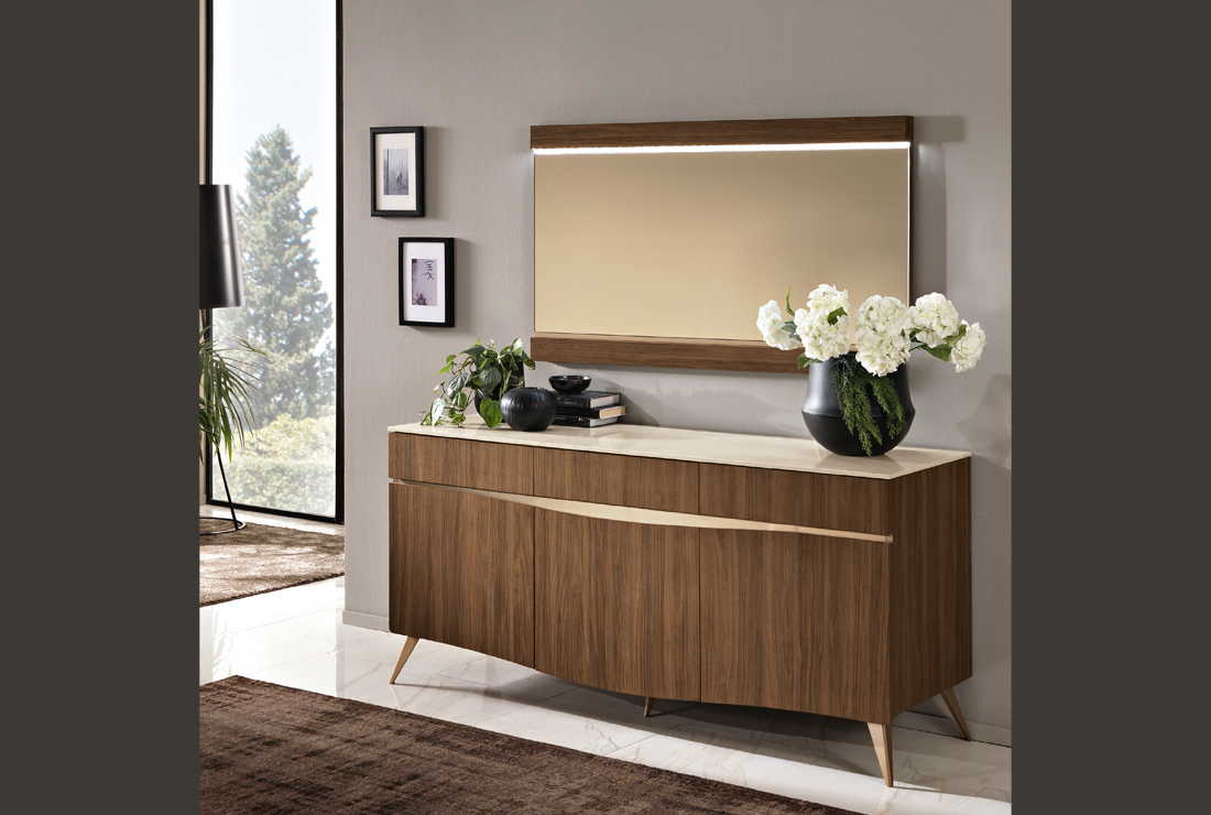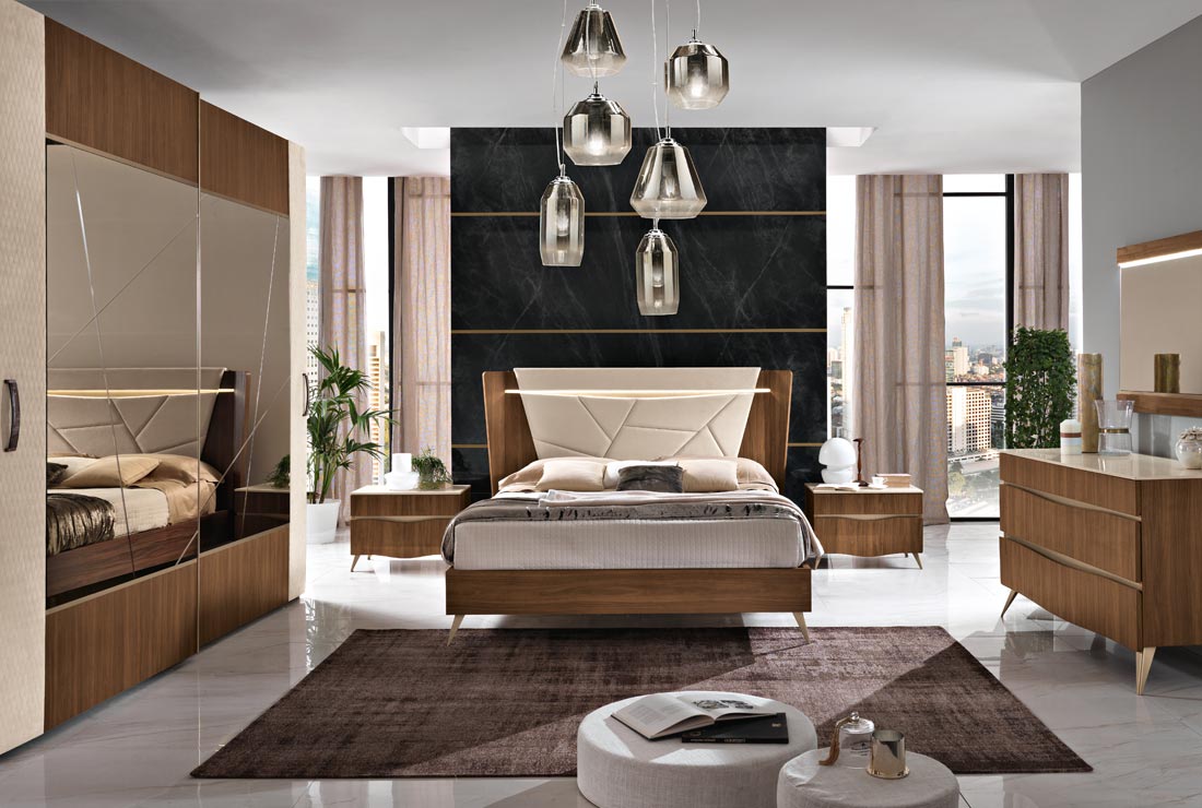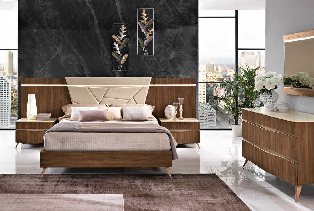 Per il nuovo millennio, ci si è ispirati al design italiano della seconda metà del secolo scorso, che ha riempito di capolavori i musei di tutto il mondo. Il legno è grande protagonista per quanto riguarda la materia. Per il segno, padrona assoluta è la sezionatura irregolare che decora la testa del letto e la grande specchiera dell’armadio.