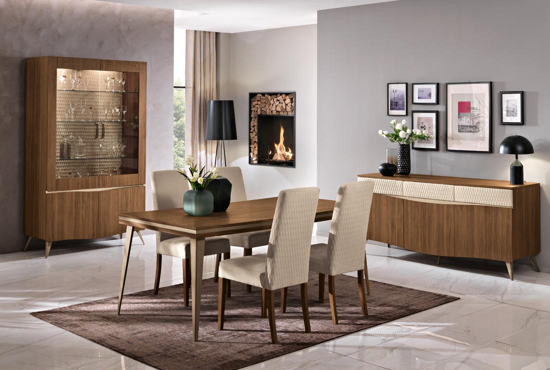 È la pulizia delle linee il grande valore di questo salotto. Credenza e consolle si fanno parallelepipedi perfetti. Unica variazione, l’elegante base arcuata del tavolo.